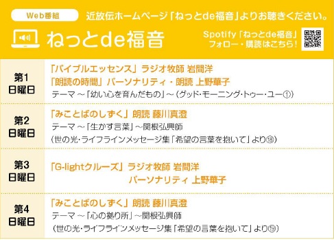 いつでもどこでも福音に触れられるインターネット番組です。現在毎週日曜日に新しい番組を配信中。聖書のメッセージやキリスト教著書の朗読、忙しい日常の中に平安と励ましをお届けします。5分~30分と皆さまの生活の中に最適な番組のラインアップでお聴きいただけます。